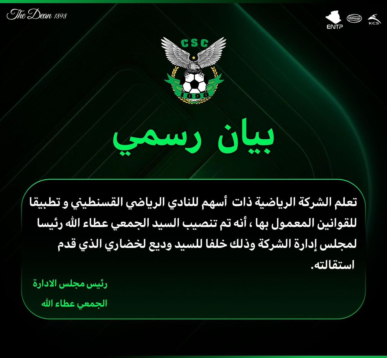 أعلنت إدارة الشركة الرياضية ذات أسهم نادي شباب قسنطينة، اليوم الأحد، عن تعيين الجـمعي عطاء الله رئيسًا جديدًا لمجلس الإدارة، وذلك تطبيقًا للقوانين المعمول بها داخل النادي.