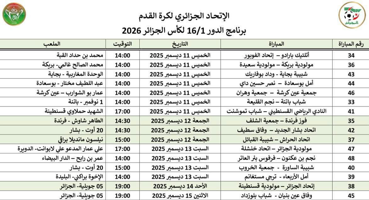 وجاء البرنامج الكامل لمباريات الدور الـ16 من منافسة كأس الجزائر، على النحو التالي: