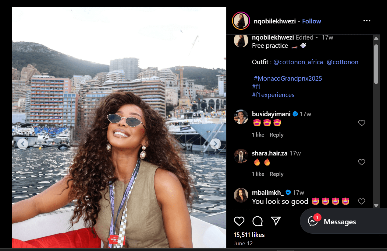 A Google Lens reverse image search reveals that the profile photo of the Facebook account does not belong to any member of the Kiir family but rather to Nqobile Khwezi, a South African media personality and influencer first posted here on 12th June, 2025. The cover photo, which has been used to lend the page credibility, shows President Kiir with Zubeidah Kananu, a journalist and television anchor with Kenya Television Network (KTN).