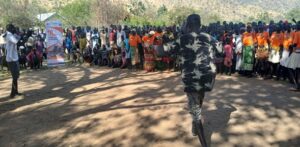 Local artist Junub Juzz performs for community members during the 16 Days of Activism Against Gender-Based Violence in Budi County, Eastern Equatoria State. – Photo credit: Roots of Generation