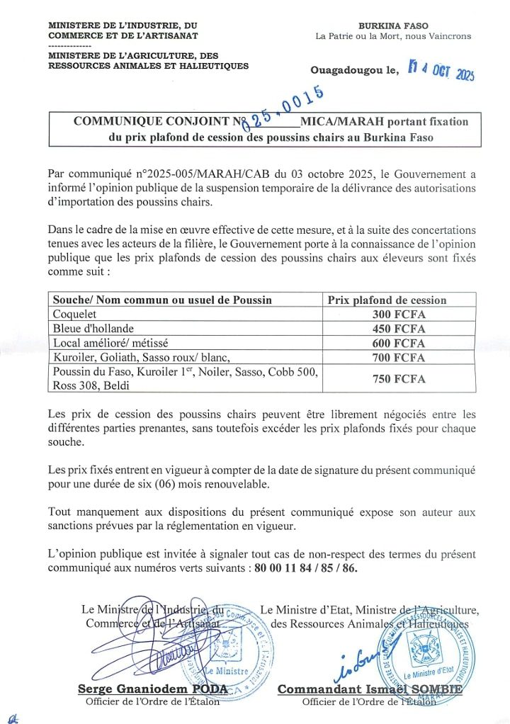 Le Gouvernement du Burkina Faso a annoncé, à travers un communiqué conjoint signé par le ministre du Commerce, Serge Gnaniodem PODA, et le ministre d’État en charge de l’Agriculture, Commandant Ismaël SOMBIE, la fixation des prix plafonds de cession des poussins chairs sur le territoire national.