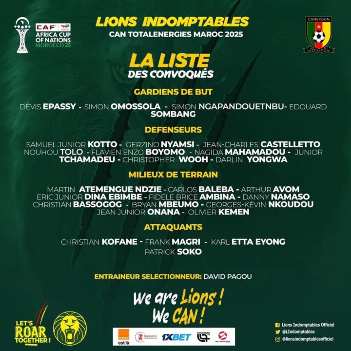 Aussitôt nommé à la tête des Lions indomptables, le nouveau staff conduit par Martin Ndtoungou Mpile et David Pagou, a rendu publique une liste de joueurs devant défendre les couleurs du Cameroun à la prochaine Coupe d’Afrique des nations (CAN) prévue au Maroc entre décembre 2025 et janvier 2026. Et comme on pouvait s’y attendre, les cadres de l’équipe sont absents, notamment le capitaine Vincent Aboubakar, le vice-capitaine André Onana, Eric-Maxime Choupo Moting, Franck Zambo Anguissa, Michaël Ngadjui, Faï Collins,…