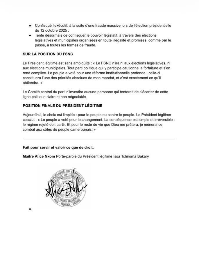 La position est désormais cristallisée. Issa Tchiroma Bakary, se présentant comme le Président légitime élu en octobre 2025, récuse en bloc la tenue des prochaines élections législatives et municipales. Pour lui et son mouvement, participer à ces scrutins reviendrait à « cautionner la forfaiture ». Cette annonce place le pays dans une impasse politique majeure, rendant tout processus électoral crédible extrêmement incertain.