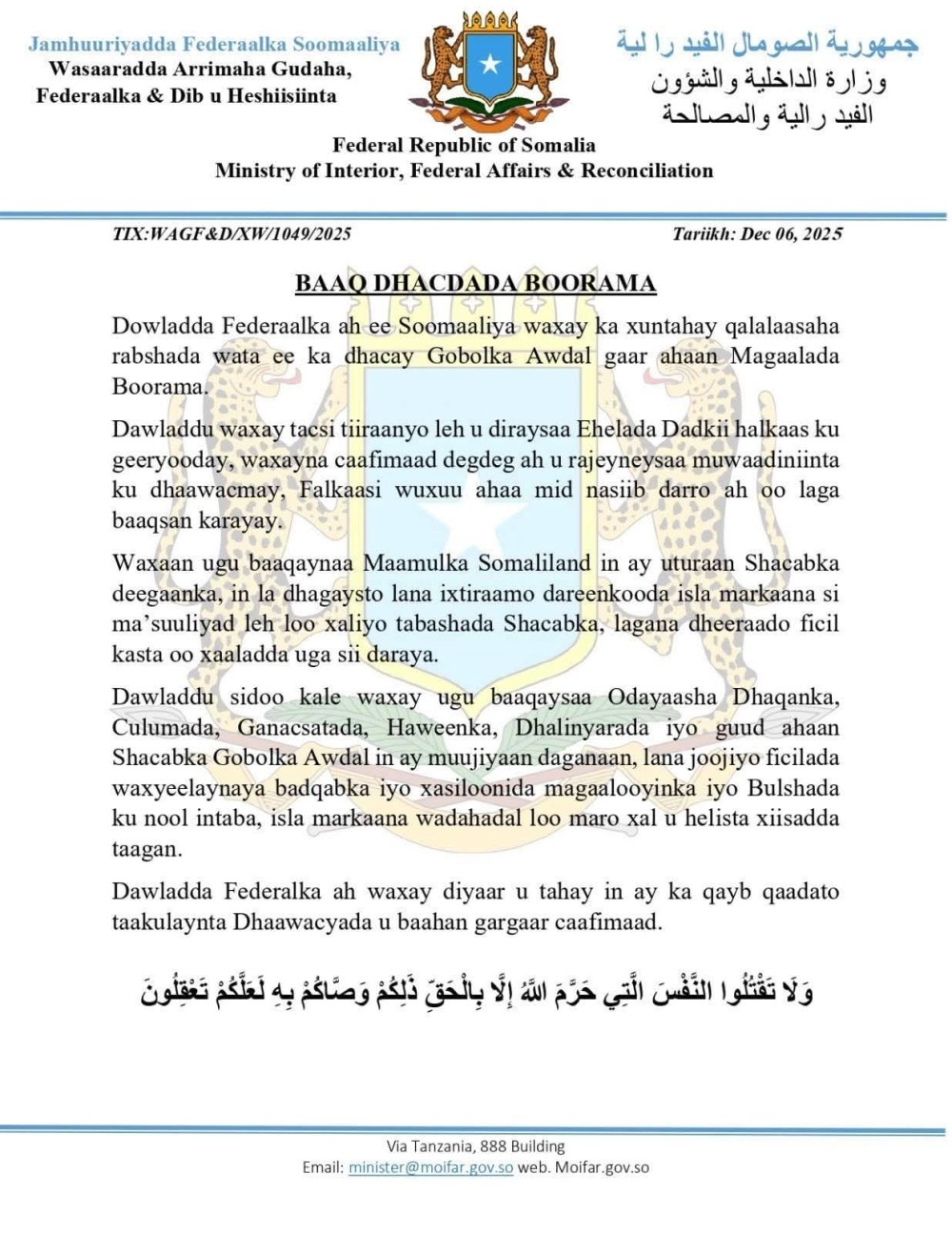 Qoraal ka soo baxay wasaaradda arrimaha gudaha ayaa lagu yiri “dowladda federaalka ah ee Soomaaliya waxay ka xun tahay qalalaasaha rabshadaha wata ee ka dhacay gobolka Awdal, gaar ahaan magaalada Boorama. Waxaan ugu baaqaynaa maamulka Somaliland in ay u turaan shacabka deegaanka, in la dhageysto lana ixtiraamo dareenkooda, isla markaana si mas’uuliyad leh loo xaliyo tabashada shacabka, lagana dheeraado ficil kasta oo xaaladda uga sii daraya”.