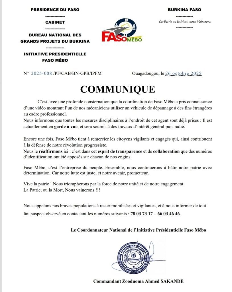 « Nous confirmons que des numéros d’identification ont été apposés sur chacun de nos engins », écrit la coordination, réaffirmant l’engagement de Faso Mêbo à préserver l’intégrité des moyens mis au service du projet. L’initiative se présente comme « l’entreprise du peuple » et rappelle son attachement à la collaboration citoyenne.