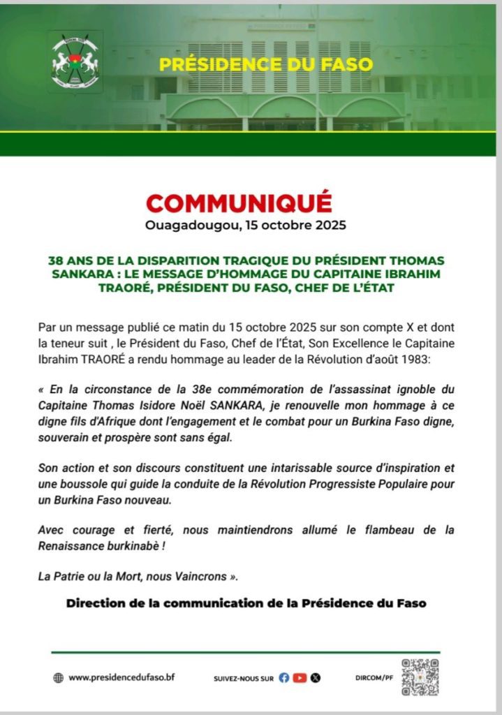 Lire aussi 👉🏿Assassinat du Capitaine Thomas Sankara : Le Président du Faso rend hommage à un grand visionnaire