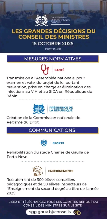 Le Conseil des ministres s’est réuni, mercredi 15 octobre 2025, sous la présidence du Chef de l’Etat Patrice Talon. Plusieurs grandes décisions ont été prises au cours de cette séance hebdomadaire.