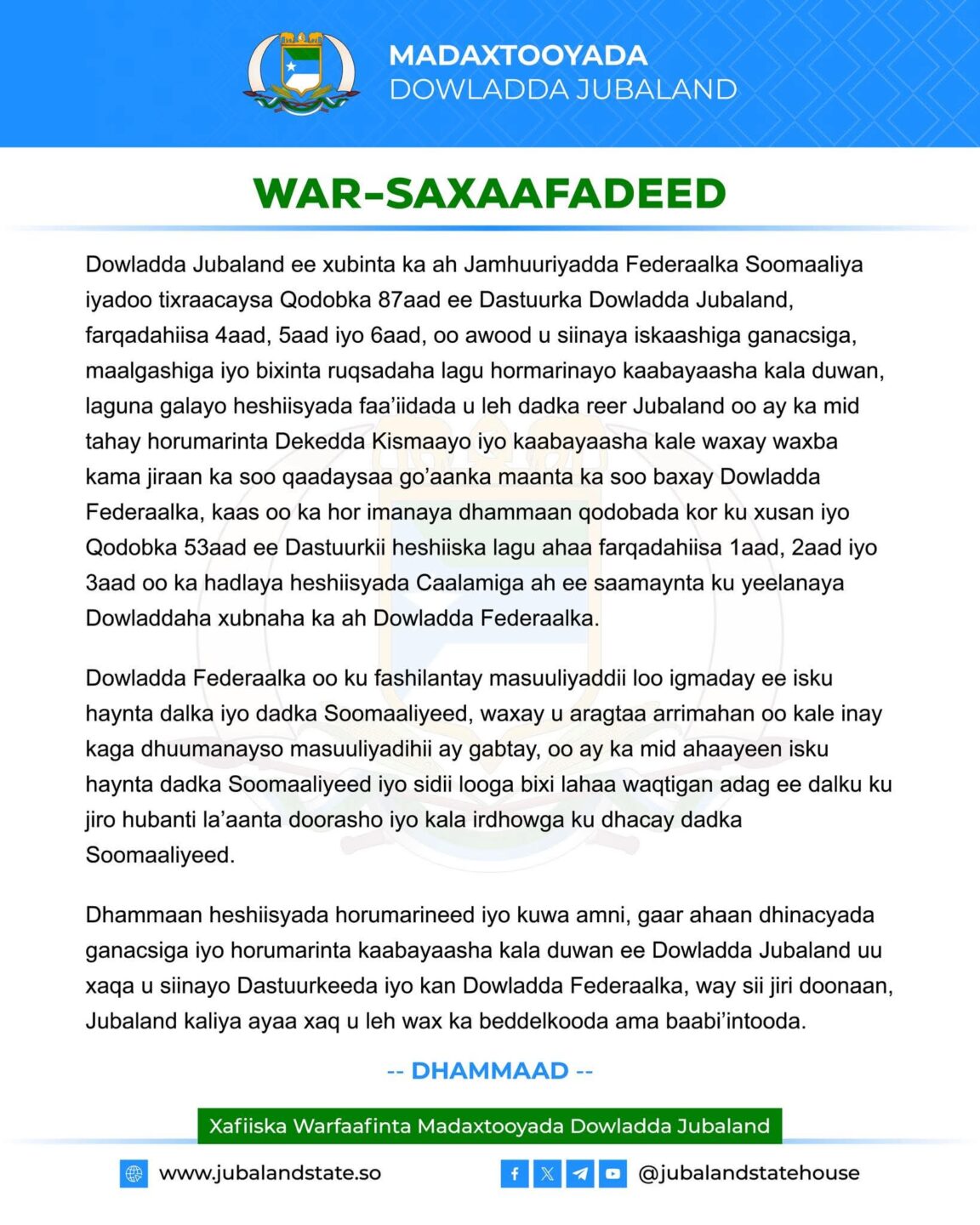 War qoraal ah oo ka soo baxay madaxtooyada Jubaland ayaa lagu sheegay in heshiisyada la xiriira horumarinta, ganacsiga iyo amniga ay ka mid yihiin awoodaha ay dastuur ahaan u leedahay Jubaland, sidaas darteedna aysan dowladda federaalka xaq u lahayn in ay baabi’iso ama wax ka beddesho.