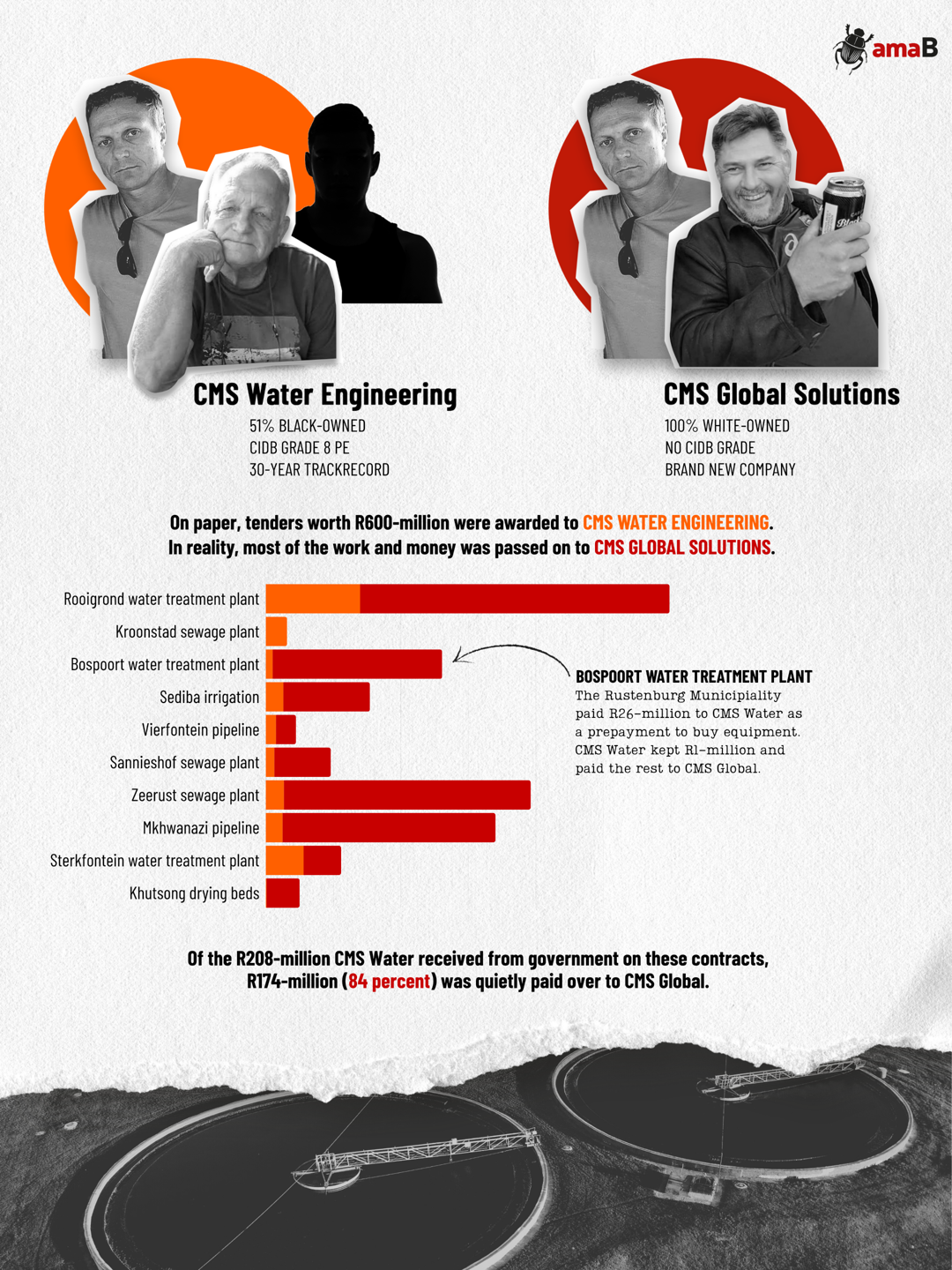 - On paper, CMS Water Engineering was a highly successful, black-owned company securing water and wastewater engineering projects across the country. In reality, Rudolf Schoeman Jnr was diverting projects to his own white-owned company, and projects were falling behind schedule.