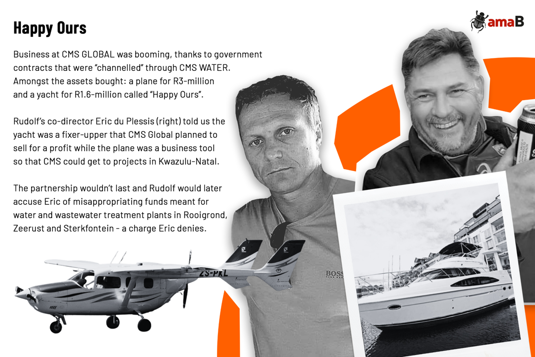 - CMS Water passed most of the work and most of the money on to Rudolf’s other company on tenders for critical infrastructure projects worth R600 milllion.