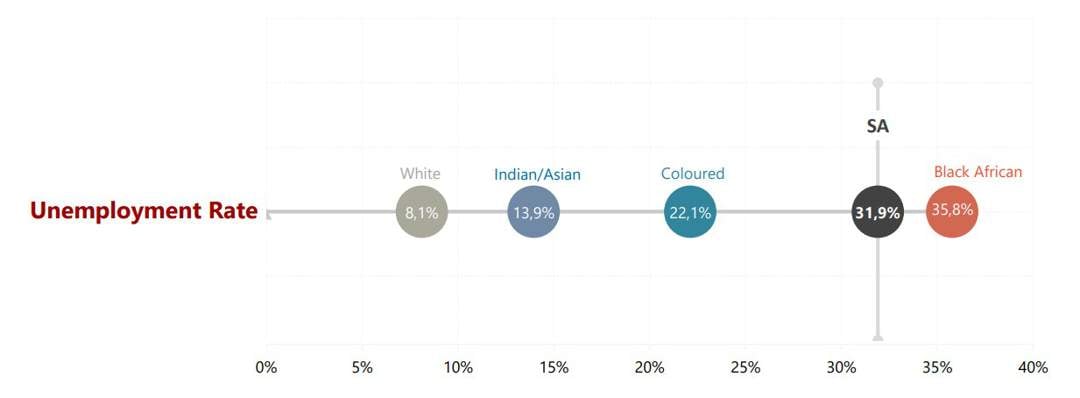 The unemployment rate among the black African (35.8%) population group remains much higher than other population groups.