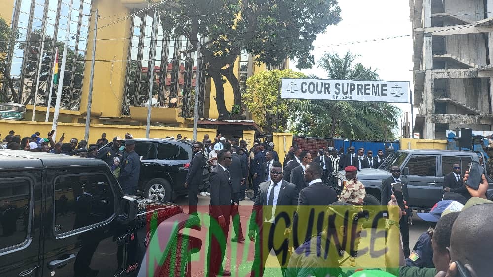 Accueilli par ses nombreux partisans, impatients depuis des heures, l’homme du 5 septembre 2021 est arrivé vêtu d’un boubou, les yeux cachés derrière ses éternelles lunettes noires, coiffé d’un bonnet blanc, la main levée pour saluer le public massivement mobilisé pour le soutenir. Le tout encadré par un imposant dispositif sécuritaire.