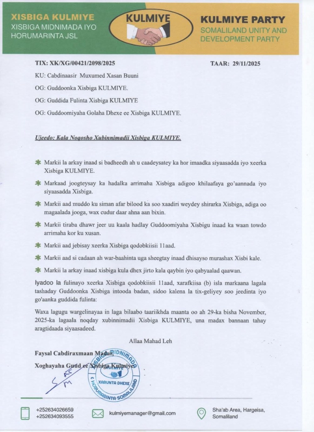 Kulmiye ayaa noqonaya xisbigii labaad ee bannaanka dhiga Cabdinasir Buuni, iyada oo hadda ka hor laga saaray xisbigii saaxadda ka baxay ee Ucid.