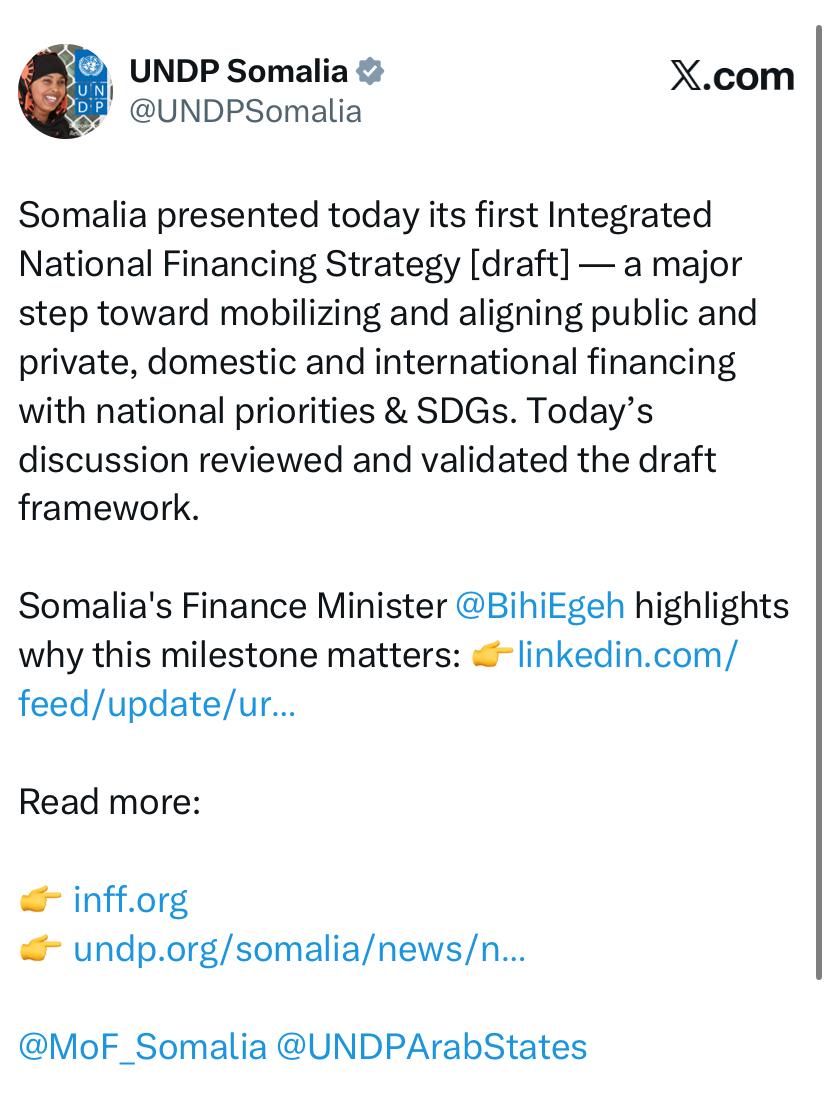 At this stage, we are examining a range of policies that will shape Somalia’s path to sustainable development. Earlier this year, we launched the National Transformation Plan (NTP), which outlines ambitious national priorities, yet many of these projects are still awaiting funding. The Integrated National Financing Framework (INFF) will provide a strategic approach to identifying financing opportunities across both the public and private sectors. It will help us determine how best to leverage these resources, strengthen coordination, and ensure that investments are aligned with our development goals. Ultimately, the INFF is about building a more coherent and resilient financing system to deliver on Somalia’s long-term vision.