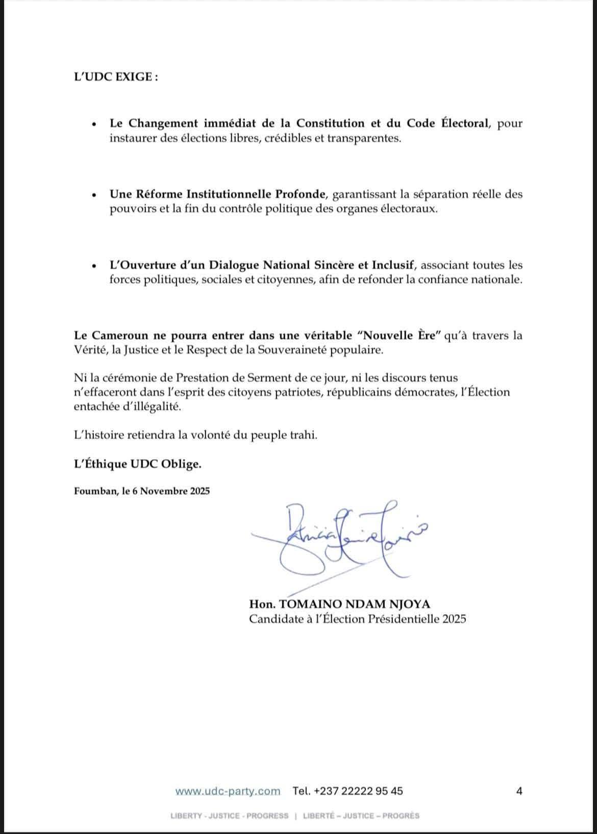 À la suite de la prestation de serment de S.E.M. le Président Paul Biya, le paysage politique camerounais s’est immédiatement trouvé secoué par une réponse cinglante de l’opposition. En première ligne, l’Union Démocratique du Cameroun (UDC) a publié un communiqué retentissant le 6 novembre 2025, rejetant fermement les conclusions du scrutin et le discours présidentiel. Ce document, signé par le candidat à la présidentielle Hon. Tomaino Ndam Njoya, ne se contente pas d’une simple contestation, il établit un réquisitoire détaillé contre le processus électoral jugé « biaisé, verrouillé et entaché d’irrégularités massives ».