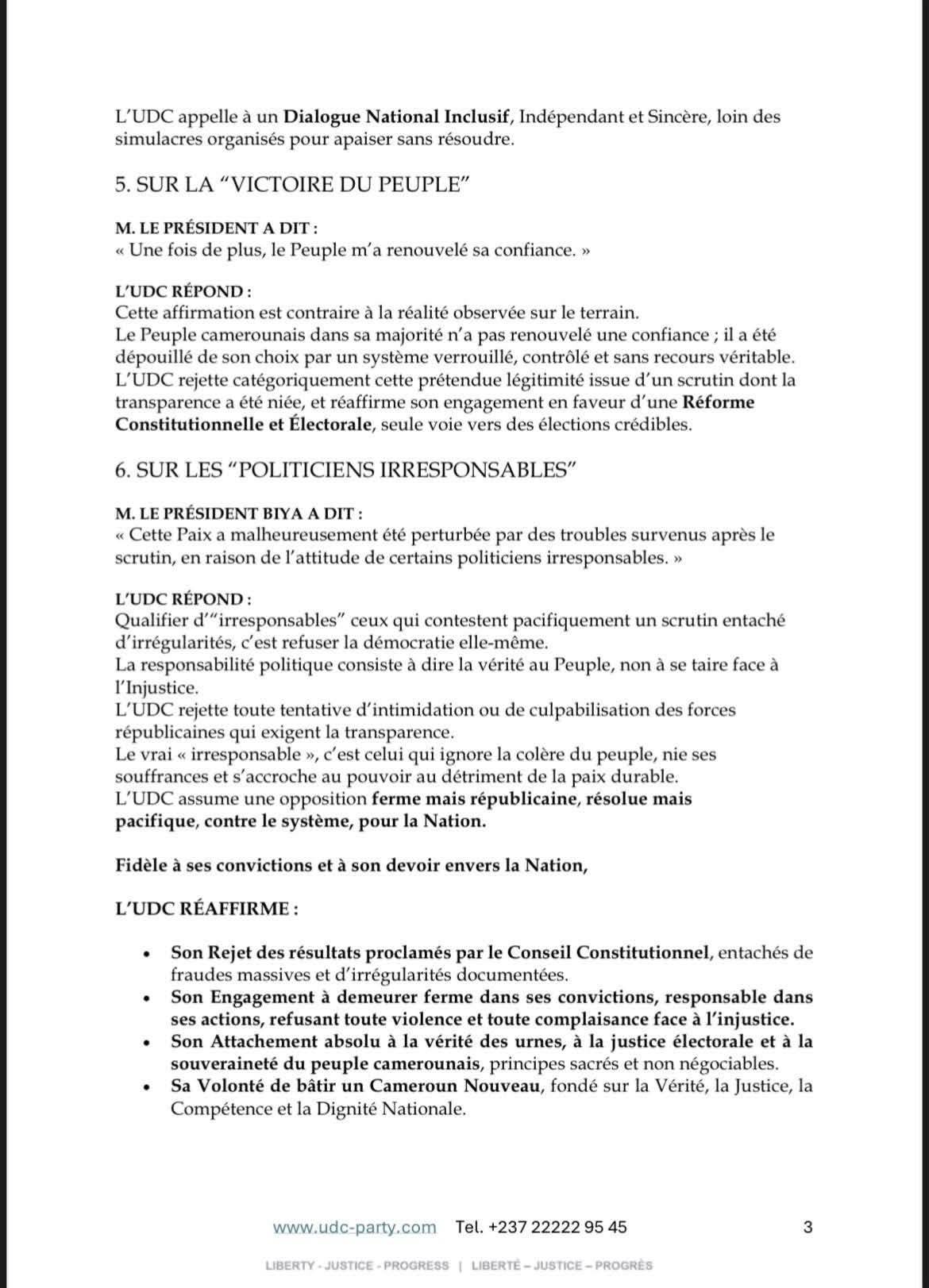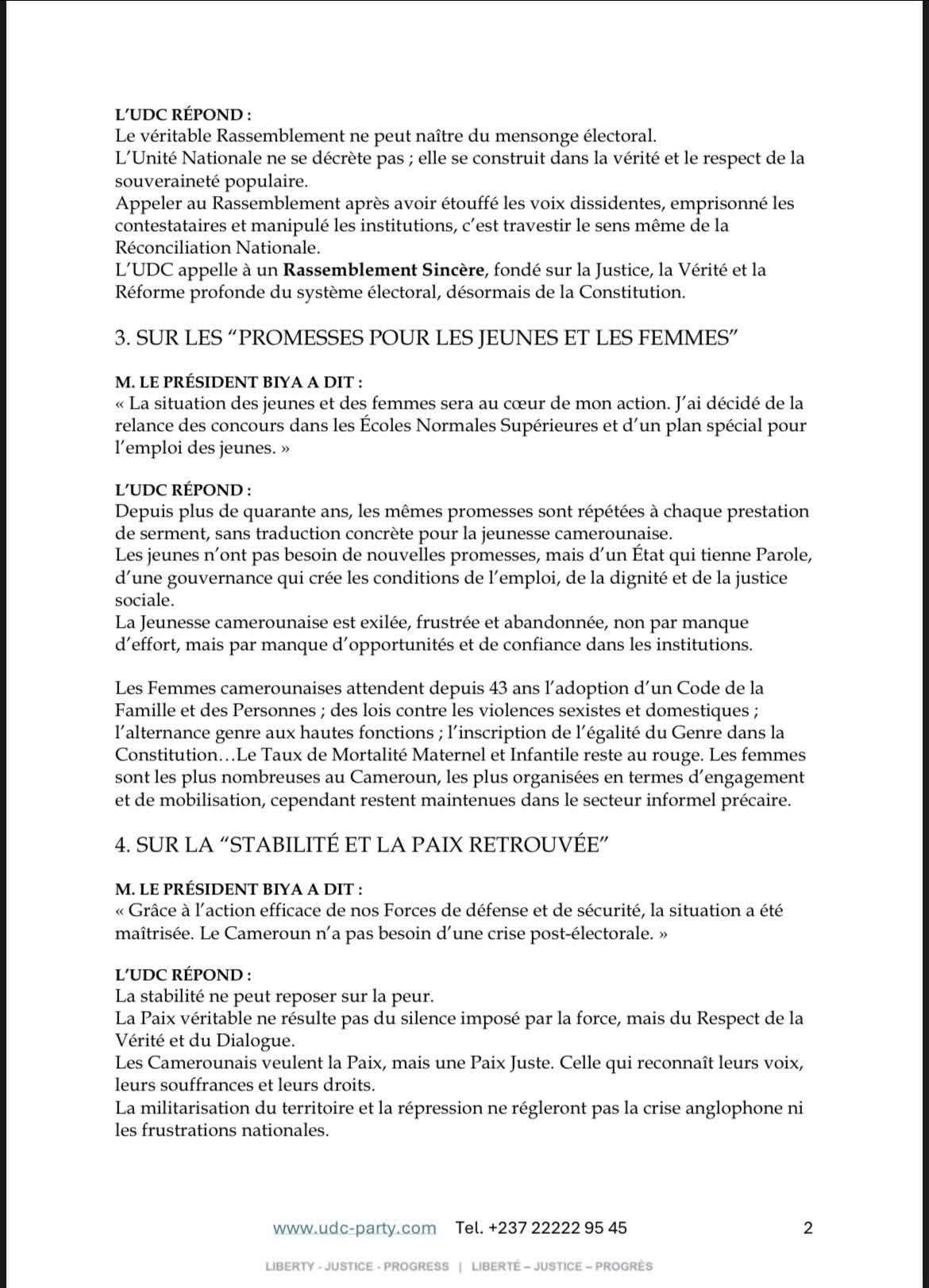 Les exigences de l’Union Démocratique du Cameroun sont claires et non négociables. Elles sont articulées autour de trois piliers fondamentaux : le Changement immédiat de la Constitution et du Code Électoral, l’institution d’une Réforme électorale profonde garantissant une séparation réelle des pouvoirs et mettant fin au contrôle politique des organes électoraux, et enfin, l’ouverture d’un Dialogue National Sincère et Inclusif. Concernant les promesses adressées à la jeunesse et aux femmes, l’UDC rappelle qu’après plus de quarante années de discours, la jeunesse camerounaise reste exilée, frustrée et abandonnée, tandis que les femmes attendent toujours la pleine application des lois.